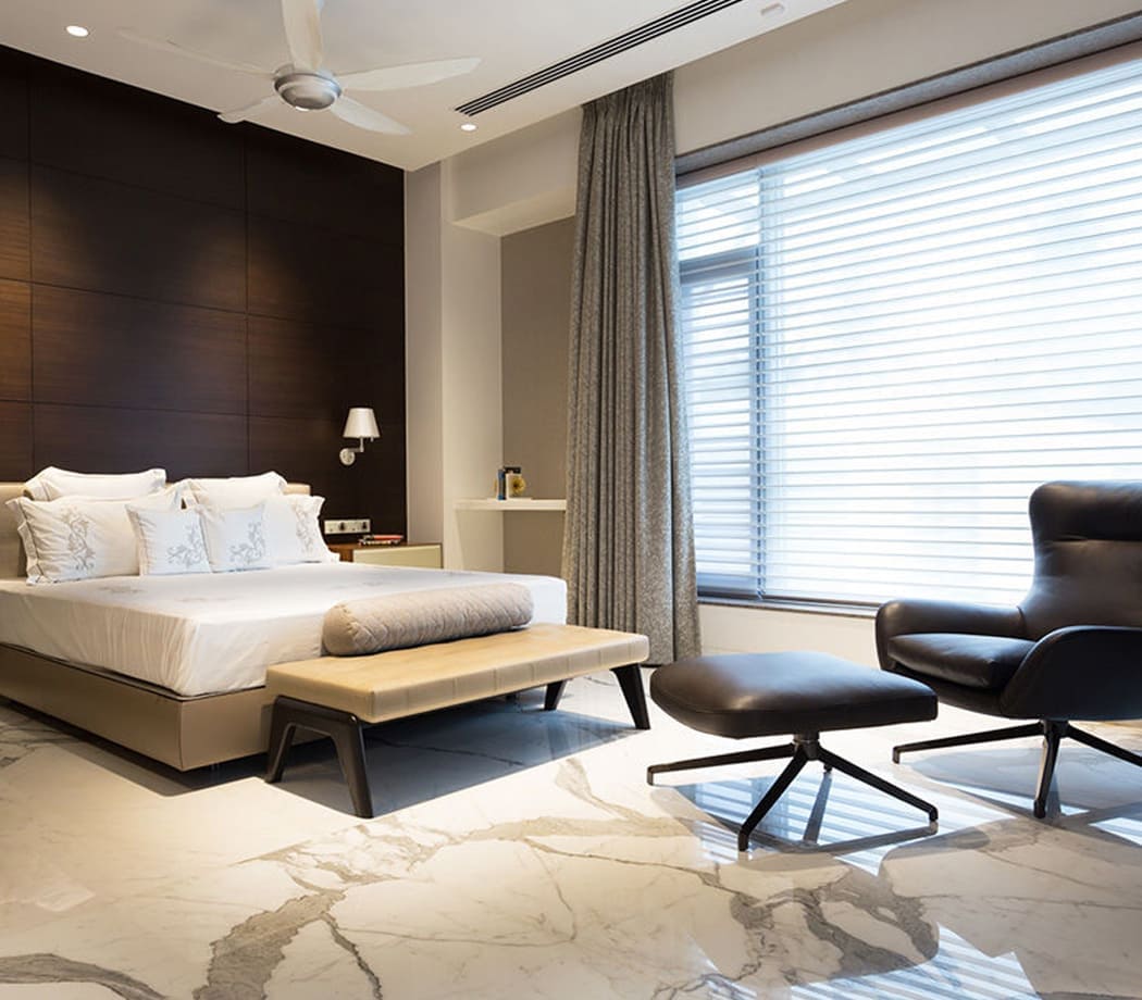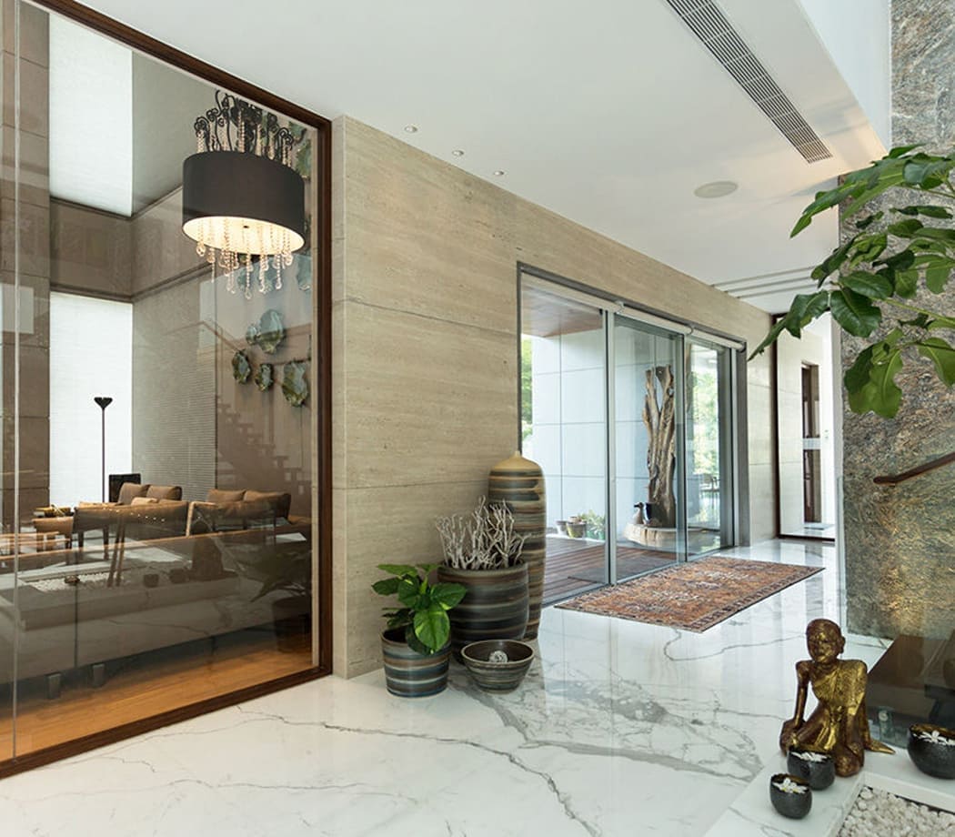 The concept for this private home in Chennai, India, was dictated by the customer’s request to design a building that would integrate seamlessly with the surrounding landscape and stay true to architectural tradition but with a sleeker, more contemporary interpretation. Entrusted with the architecture and interior design, the studio of Arvind Varuna Associates crafted a home that blends elegance and comfort, and incorporates local decorative elements, in a mix as successful as it is eclectic.