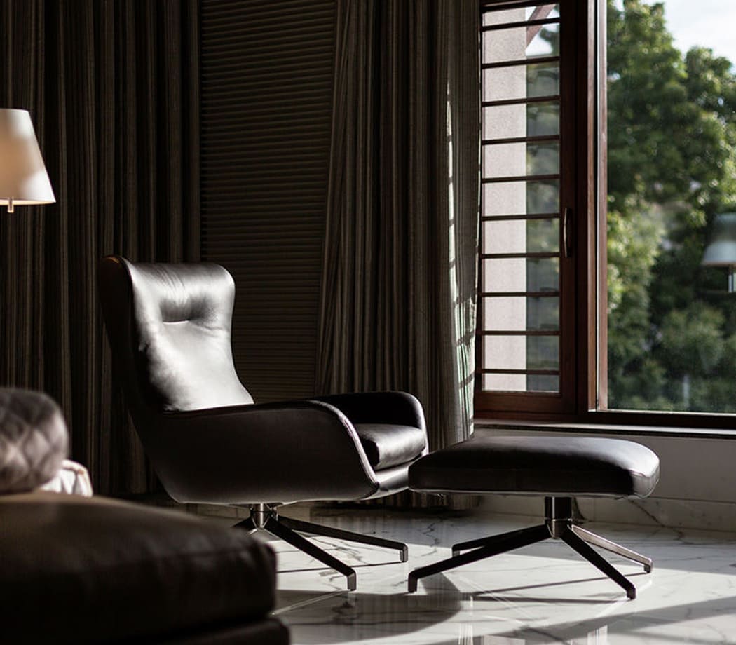 The materials employed tend toward the organic choices, like marble, along with stone, glass combined with teak, and a color palette of natural shades, for a ‘natural chic’ effect that is also echoed in the choice of seating upholstery, for the most part a sophisticated beige leather. The spacious, light-filled living room is furnished with a corner composition of the Allen seating system, paired with Blake-Soft armchairs and Perry and Brice coffee tables. A second lounge area features Sherman sofas flanked by Jensen armchairs, Sullivan coffee tables and a Wilson console. In the master bedroom, the Bedford Bed holds pride of place, with Morrison nightstands, Kirk Bench and a Jensen armchair and matching footstool.
